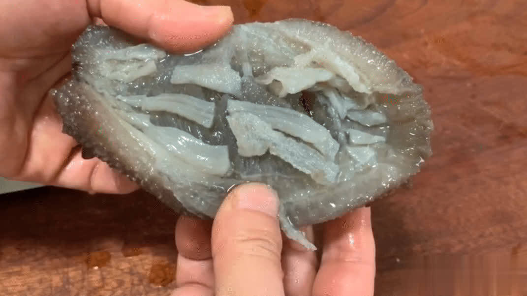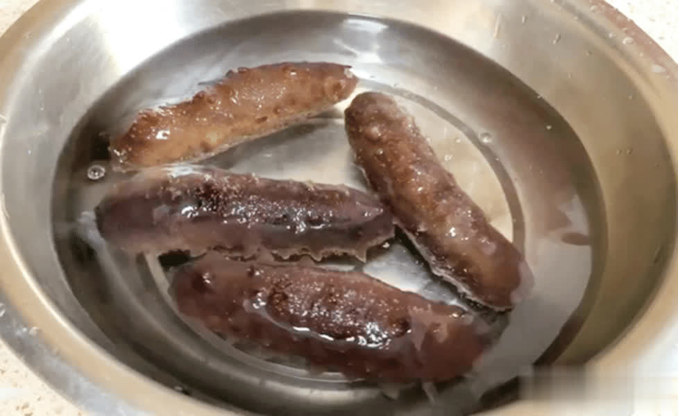 把海参放进纯净水里自然解冻,这是解冻好的海参,泡发海参的时候把里面的筋剪开,这样泡发得更大,筋一定不要扔掉,很多人不懂都扔掉,那就可惜了。把海参切成大块,